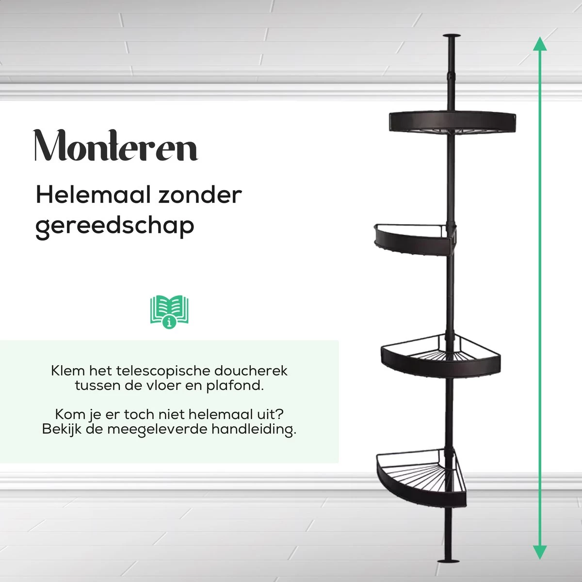 Klem het doucherek simpelweg tussen de vloer en het plafond en installeer het rek binnen enkele seconden. Er komt geen boor of tape aan te pas. Kan het nog makkelijker?