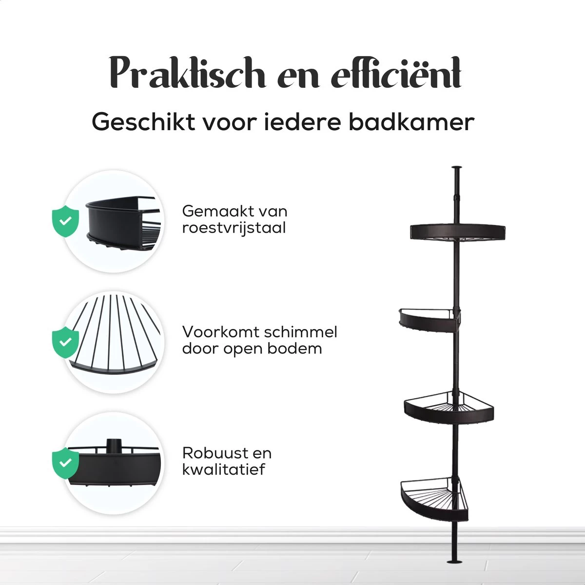 Met 4 ruime rekjes geef jij al je douchespullen een plekje. Elk rekje heeft een extra hoge draagkracht, bestaat uit duurzaam materiaal en kan al jouw producten aan.