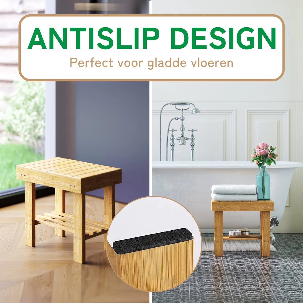 Onze Bamboe Design Douchekruk is simpel en ongecompliceerd: geen moeilijk gedoe met inklapbare of verstelbare poten waar je handen klem tussen kunnen komen zitten. Dit is een no-nonsense kruk die gewoon doet wat hij moet doen, en een ideale oplossing voor in de badkamer.