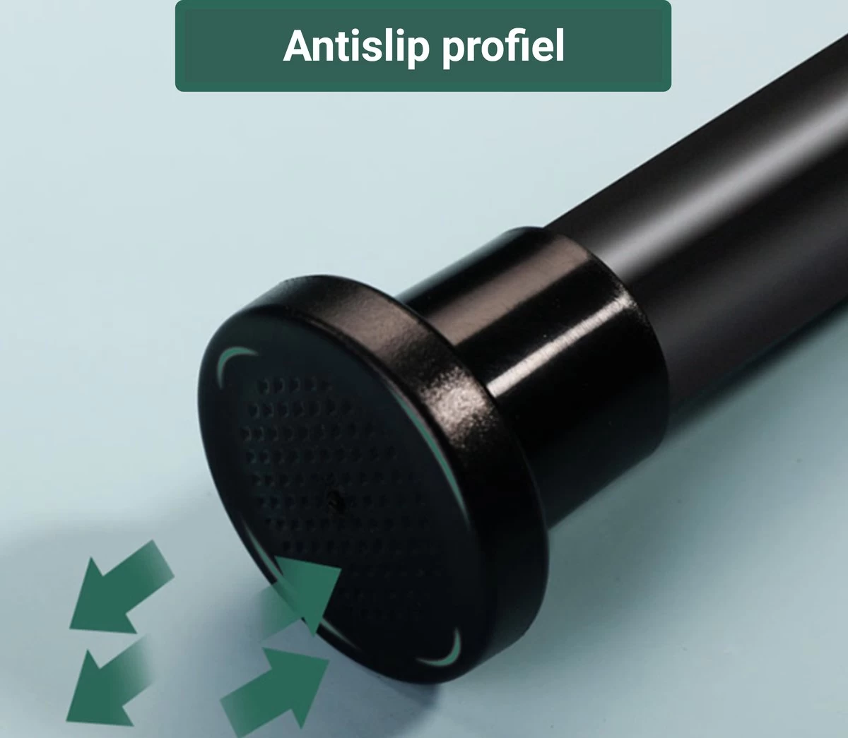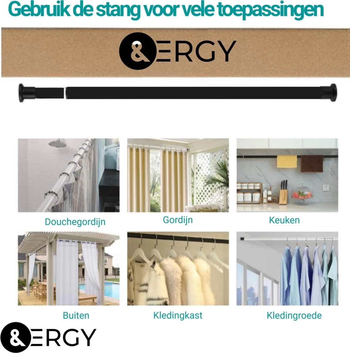 Met deze uitschuifbare douchestang van het merk &ERGY® kunt u een douchegordijn ophangen tussen muren van 70 tot 110 centimeter. Door de druk die de stang uitoefent op de muur en de anti-slip uiteinden van de stang, blijft de stang op z’n plek. Je hoeft dus niet te boren in je (badkamer)wand! De stang is te gebruiken op alle soorten oppervlakten.