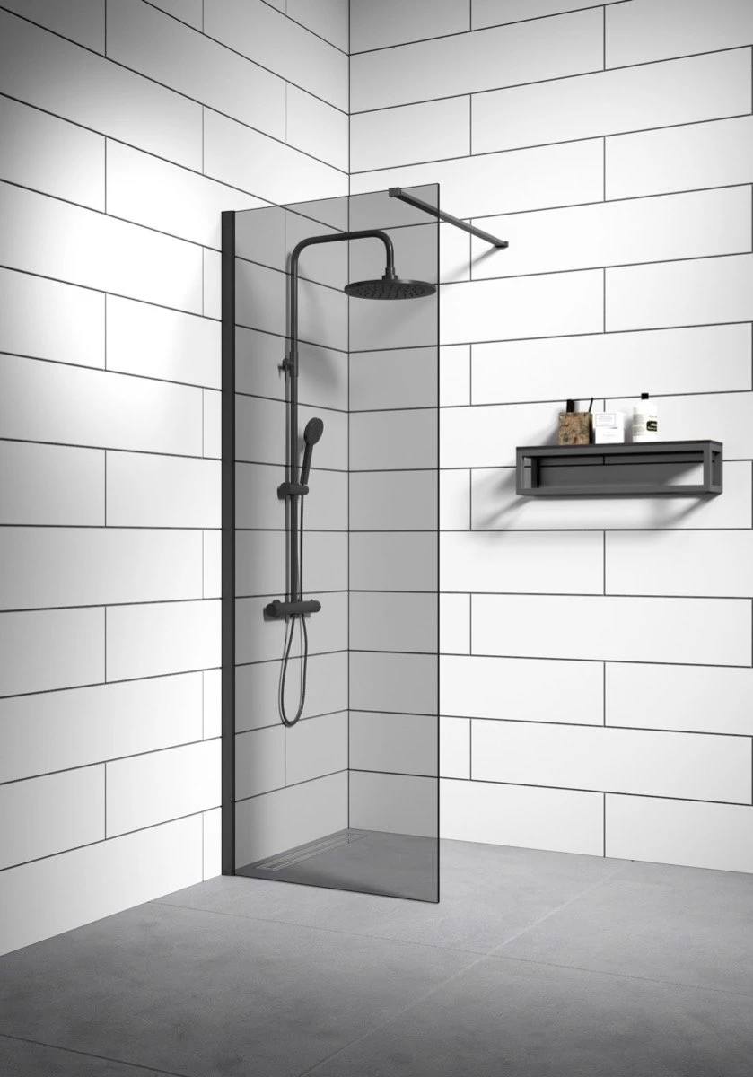 Douchewand Rizani 50cm gemaakt van 8mm dik getint veiligheidsglas voorzien van nano coating. Afmeting 50 x 200cm.De inloopdouche wordt geleverd met zwarte profielen en montagemateriaal.
