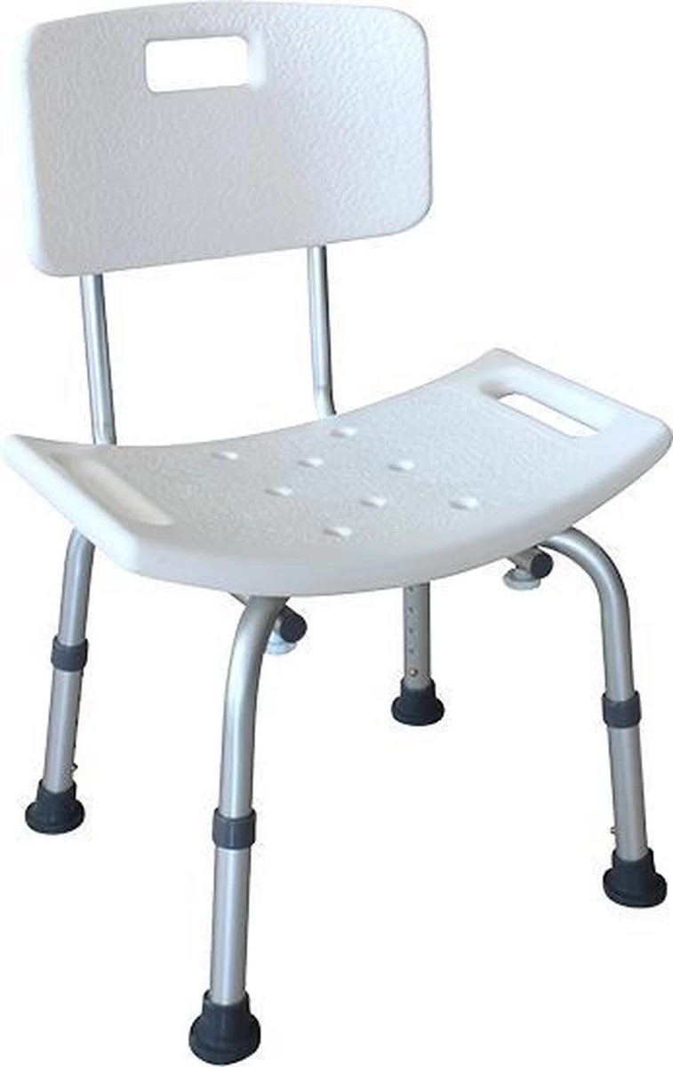 Waterdoorlatende douchekruk met rugleuning, antislipzitting en antislipknoppen op de voeten. Materiaal: gepoedercoat aluminium frame. In 5 standen verstelbare stoel. Toegestaan totaalgewicht 100 kg. Ideaal voor elke douche.