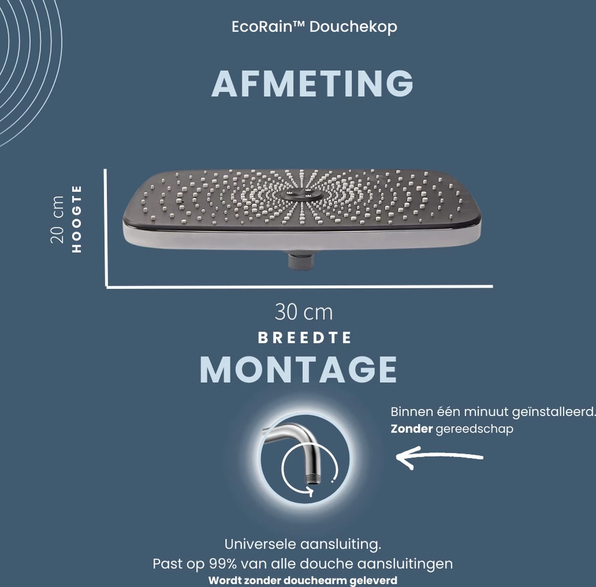 De hoogstaande EcoRain™ Douchekop heeft alles in huis om de ultieme douchebeleving te creëren voor jou. Met een afmeting van 30 x 20 cm zorgt de Grote Douchekop ervoor dat jouw hele lichaam omringd wordt met heerlijke warme waterstralen. Vele douchekoppen zijn net te klein en zullen niet jouw volledige lichaam besproeien met dat heerlijke en warme water, een groot gedeelte vat dus kou door conventionele douchekoppen. Dat wil je liever niet, toch?