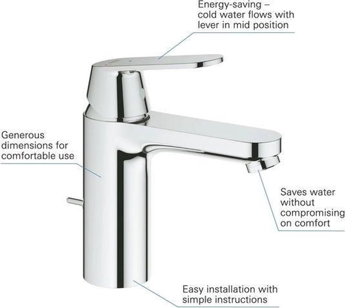 Comfortabel én zuinig omgaan met water: met de Eurosmart Cosmopolitan wastafelkraan met GROHE SilkMove® ES technologie. Intelligente technologie voor het moderne huishouden. Als de hendel in de middenstand staat, gebruik je alleen koud water. Zo bespaar je tijdens dagelijkse badrituelen zoals handen wassen en tanden poetsen al snel veel energie. En dat scheelt ook in de portemonnee. Wil je het water toch lekker warm, beweeg de hendel dan simpelweg naar links. Met GROHE EcoJoy® kan je tot wel 50% in je verbruik besparen. Het mooie design, de onderhoudsvriendelijk chromen coating en trek-waste maken het plaatje compleet.