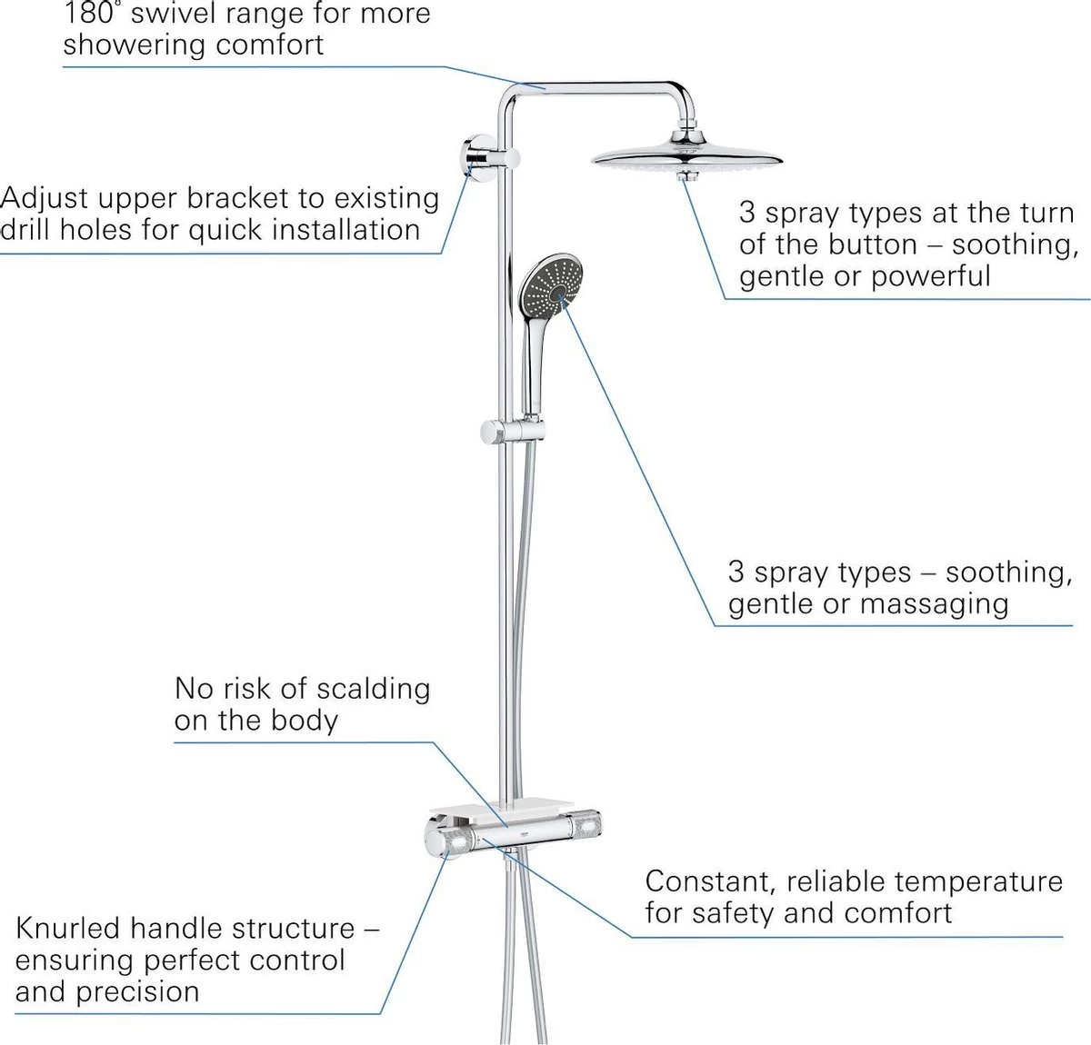 Stel je eens voor, een douche die stijl, nauwkeurige bediening en zes plezierige straalsoorten biedt en tegelijkertijd totale veiligheid garandeert. Dit alles biedt de Vitalio Joy 260 douche, die dankzij de makkelijke installatie de perfecte keuze vormt voor zowel nieuwe badkamerontwerpen als snelle upgrades. Deze douche zit boordevol GROHE’s geavanceerde technologie en heeft ergonomische handgrepen waardoor deze ook een genot is om te bedienen. De bediening is intuïtief met de GROHE ProGrip-grepen met gekarteld oppervlak – de bediening is makkelijk, zelfs als je gladde handen hebt.