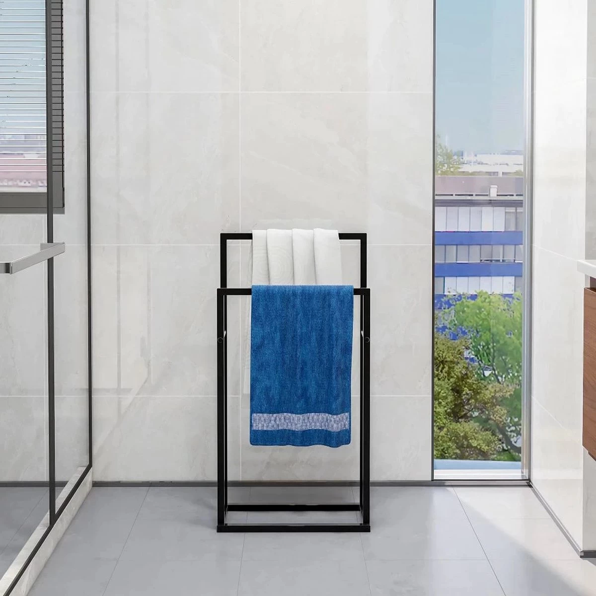 GDRN staande handdoekhouder. Dit stijlvol onworpen handdoekrek is zeer functioneel in gebruikt. Het kan voor kleding, handdoeken en andere hangende producten gebruikt worden. Daarnaast past het tijdloze design in vrijwel elk interieur!