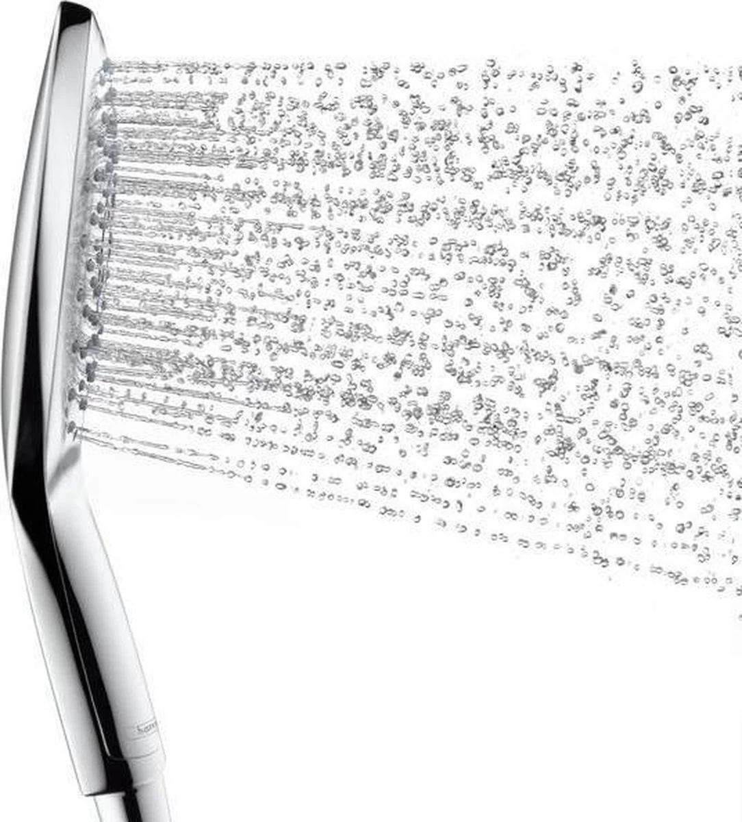 Met de hansgrohe Raindance Select S 150 3jet handdouche wordt de dagelijkse douche een XXL-comfortplezier. De 150 mm grote douchekop biedt 3 straalsoorten, die met een druk op de knop kunnen worden verwisseld. De RainAir-straal streelt lichaam en geest als een zachte zomerregen. De met lucht verrijkte CaresseAir zorgt voor ontspanning met volle waterstralen. De krachtigere gemengde straal verwent met een combinatie van zachte regen en dynamische straal die de shampoo grondig uitspoelt en aangenaam masseert.