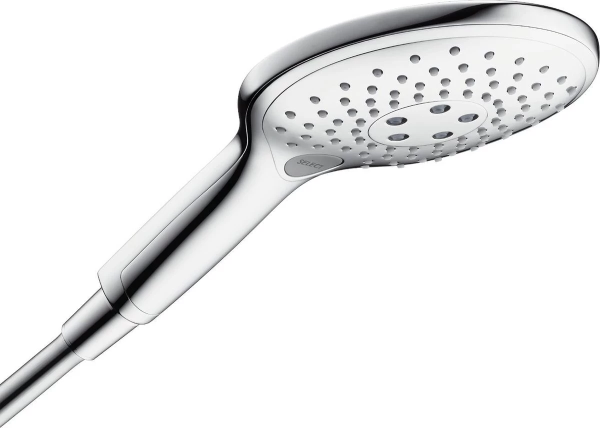 De moderne, vlakke handdouche met ronde kop maakt ieder bad mooier en kan worden gecombineerd met alle kraan- en tegeldesigns. Trendsettend design, ook op het gebied van ergonomie: De greep voelt licht in de hand, zodat de Select-knop met één vinger kan worden bediend.