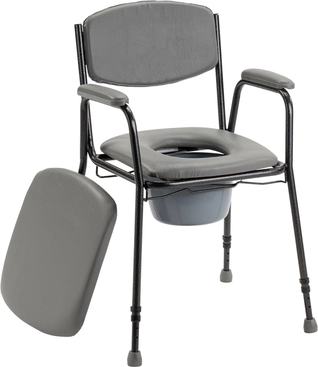 Deze in hoogte verstelbare toiletstoel is een stijlvolle en comfortabele Toiletstoel. Deze Toiletstoel heeft waterafstotende zachte bekleding en een gecoat metalen frame. De Toiletstoel is voorzien van een zachte zitting die over de opening geplaatst kan worden.