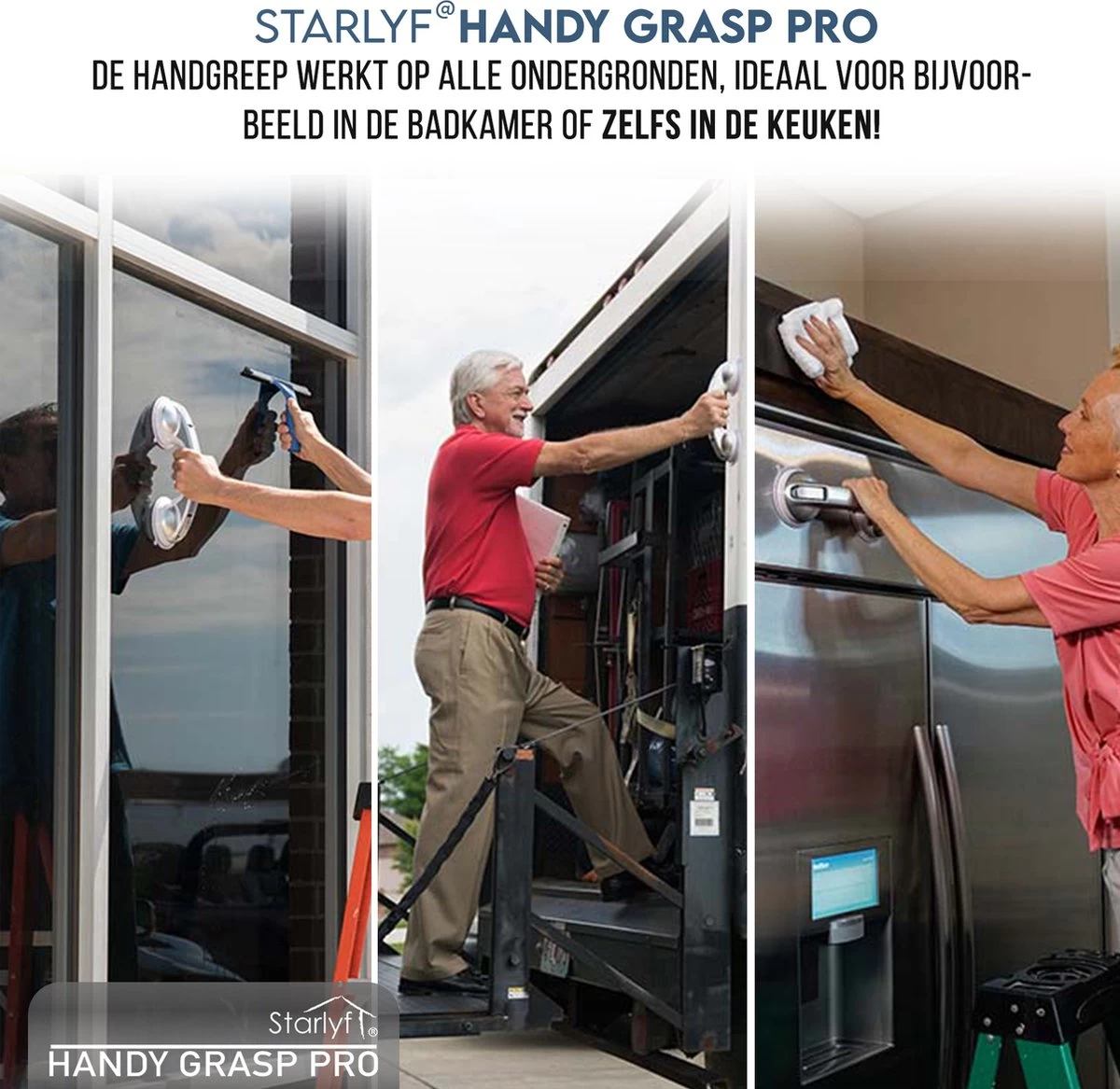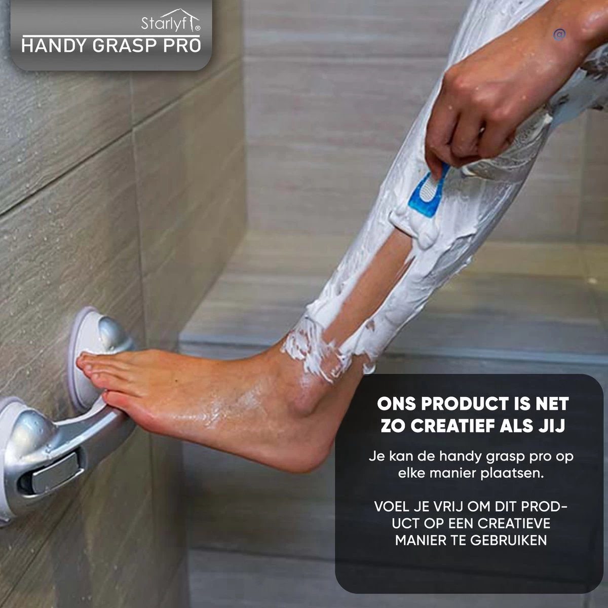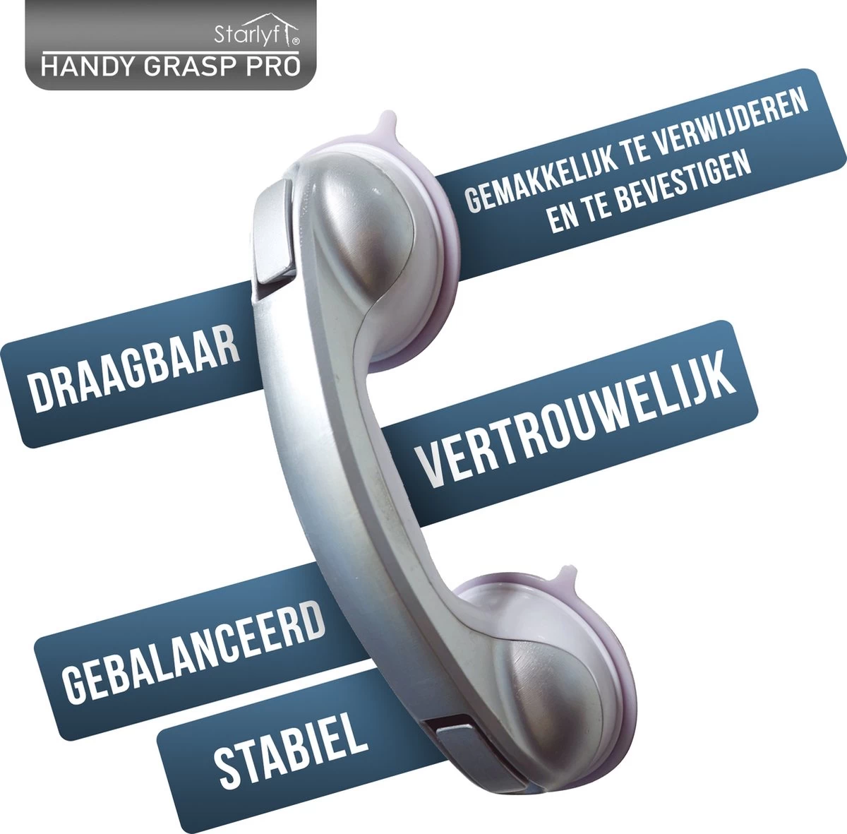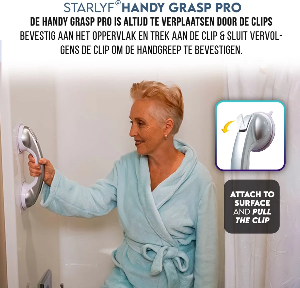 De Handy Grasp Pro is bedoeld om mensen te ondersteunen bij natuurlijke bewegingen, denk hierbij aan het verlaten van de douche. De handgreep is in enkele seconden makkelijk te bevestigen op de door uw gewenste plek. De Handy Grasp Pro is extra lang, namelijk 30,5 cm zodat u zich goed vast kan houden.