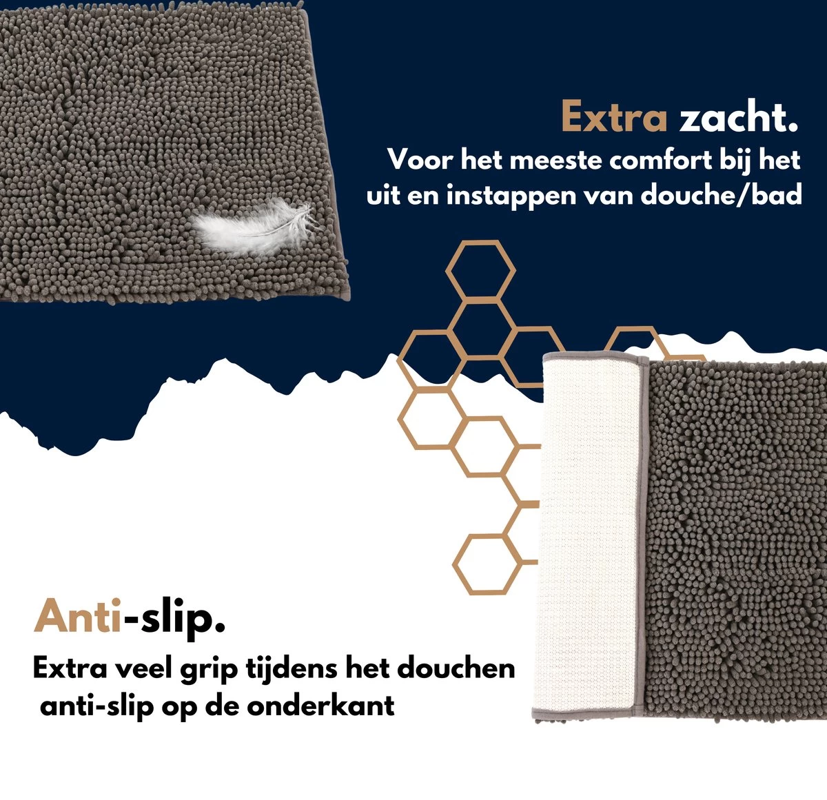 De douchemat is afgewerkt met antislip structuur, antibacteriële coating, een water absorberend materiaal en voorzien van de sterkste anti-slip wat zorgt voor extra grip, veiligheid en comfort.