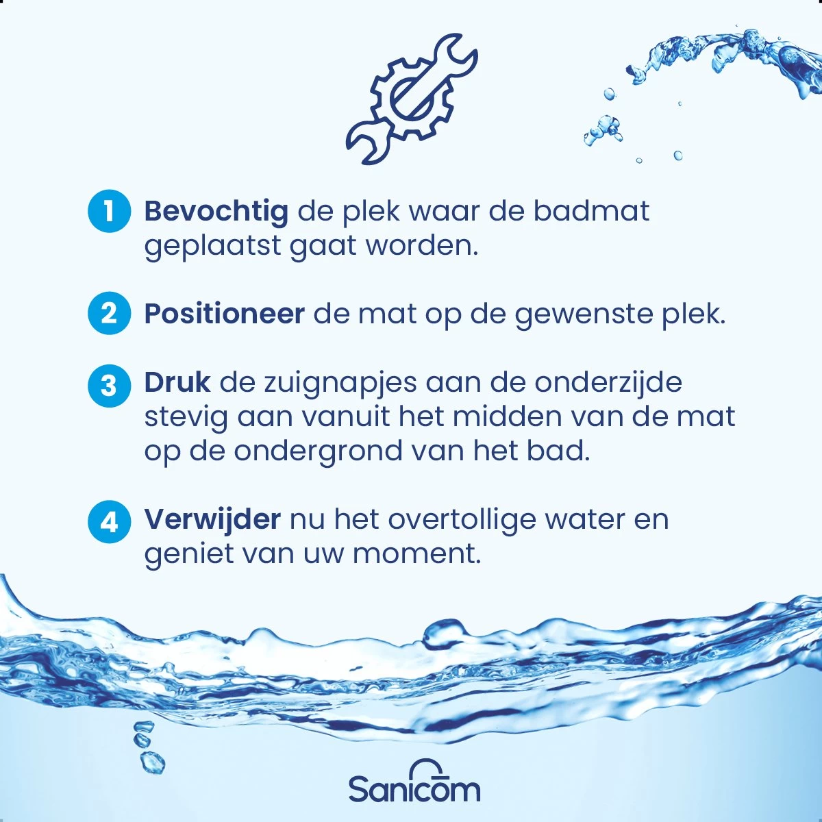 Een stevige antislipmat zorgt ervoor dat jouw badkamer en douche weer een veilige plek worden. De antislip douche- en badmatten van Sanicom beschikken over veel en sterke zuignappen zodat de mat extra grip heeft. Daarnaast kan door het slimme ontwerp gemakkelijk al het water weglopen, zo voorkom je extra vochtigheid en schimmelvorming. Zo blijft jouw badkamer veilig en schoon.