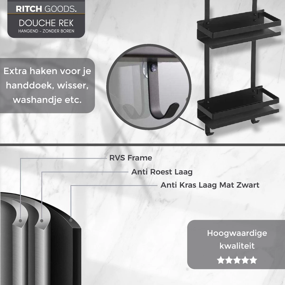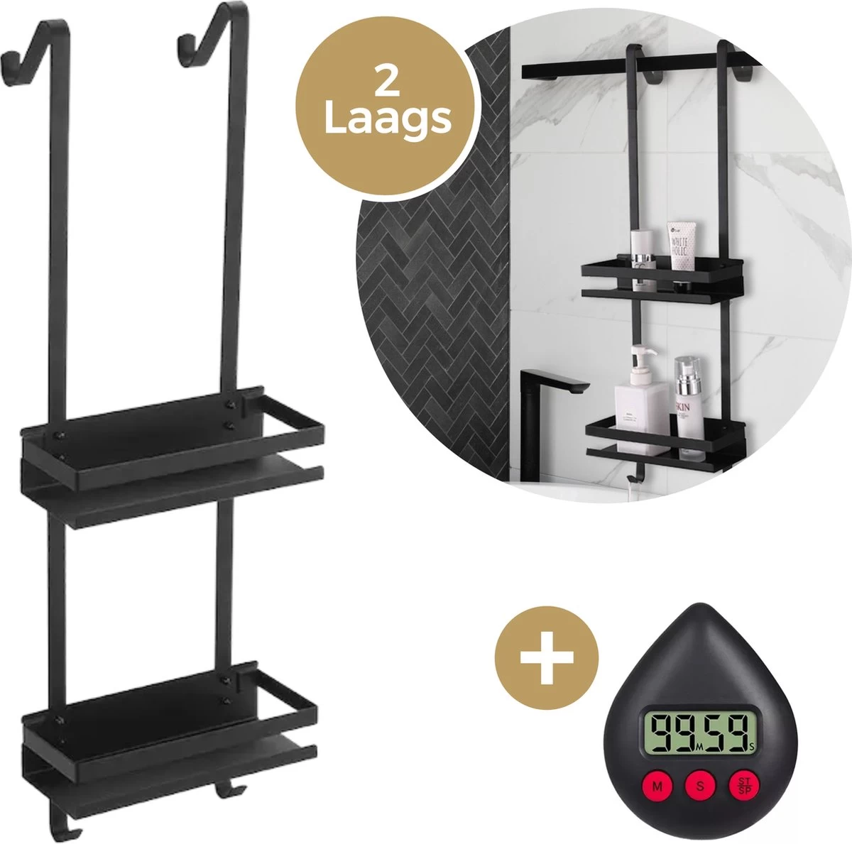 Het hangend doucherek is voorzien van 2-lagenvoor al jouw douchespullen. Berg shampoo, douchegel, conditioner, scheerschuim en mesjes netjes op. Altijd binnen handbereik!