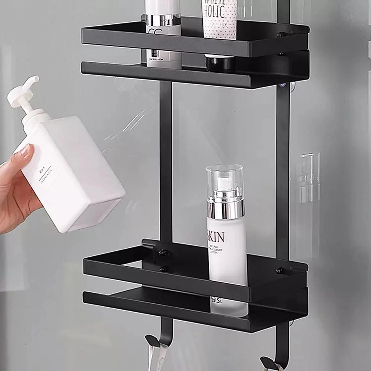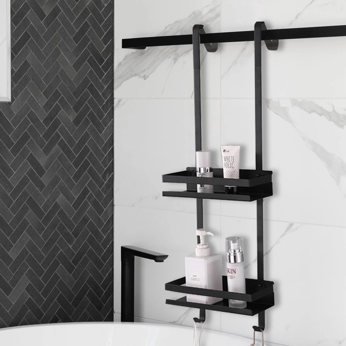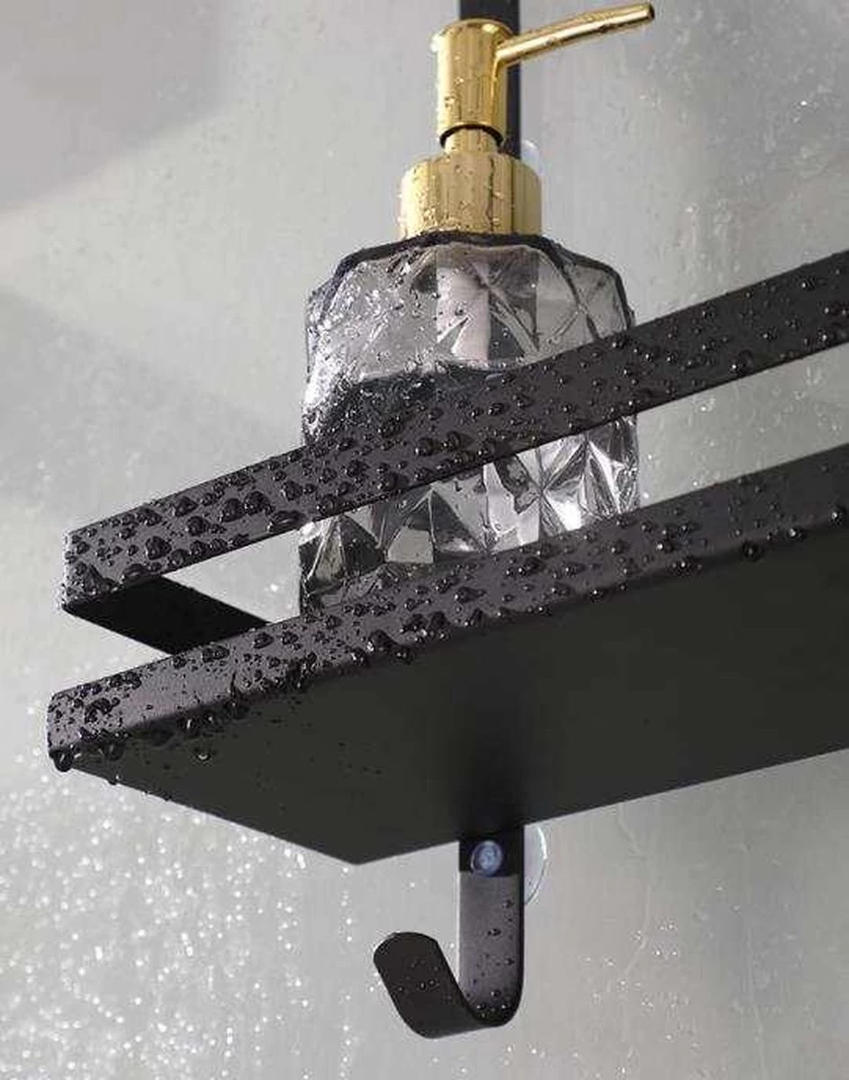 Organiseer alle douchespullen op één plek. Het ruime zwarte doucherek maakt jouw douche weer netjes.