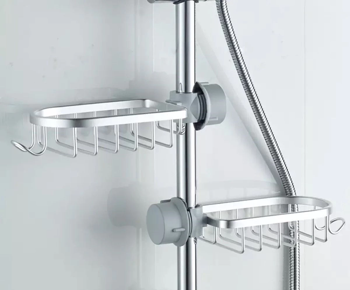 Een stevige doucherek zonder boren of zuignappen? Dat kan! Onze doucherek is vast te maken aan uw douchestang (glijstang) en blijft verbluffend goed zitten. Het is aluminium en waterbestendig tegen roest. Door de gaten houdt het rek geen vocht vast en is het niet nodig om het te spoelen. Groot van formaat voor meerdere bad artikelen met nog eens een haak voor uw badspons.