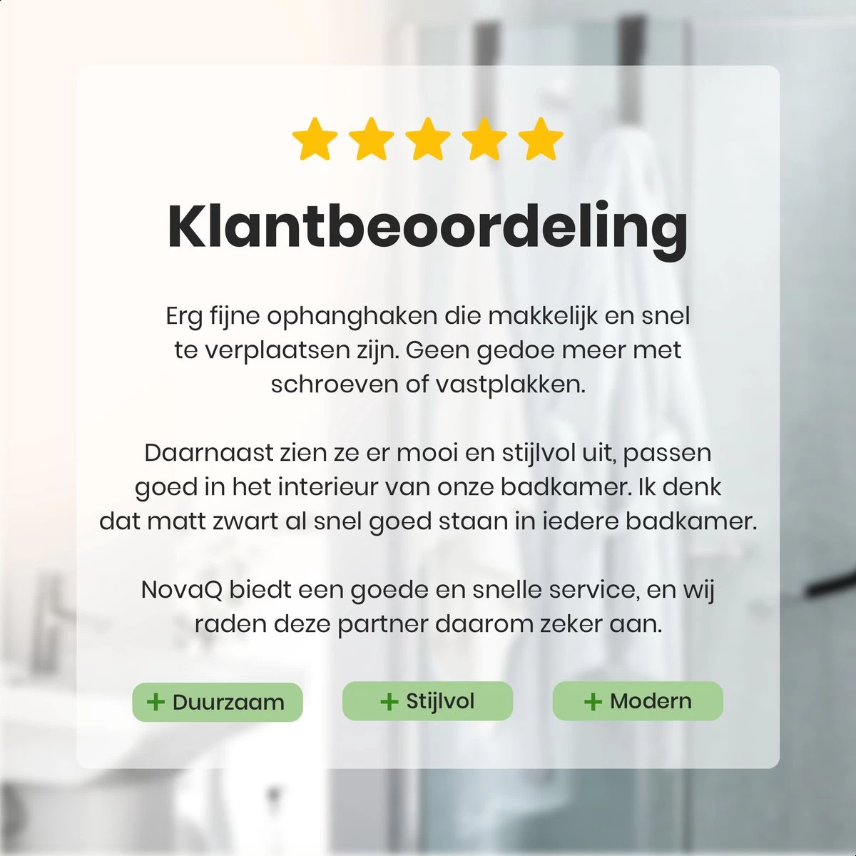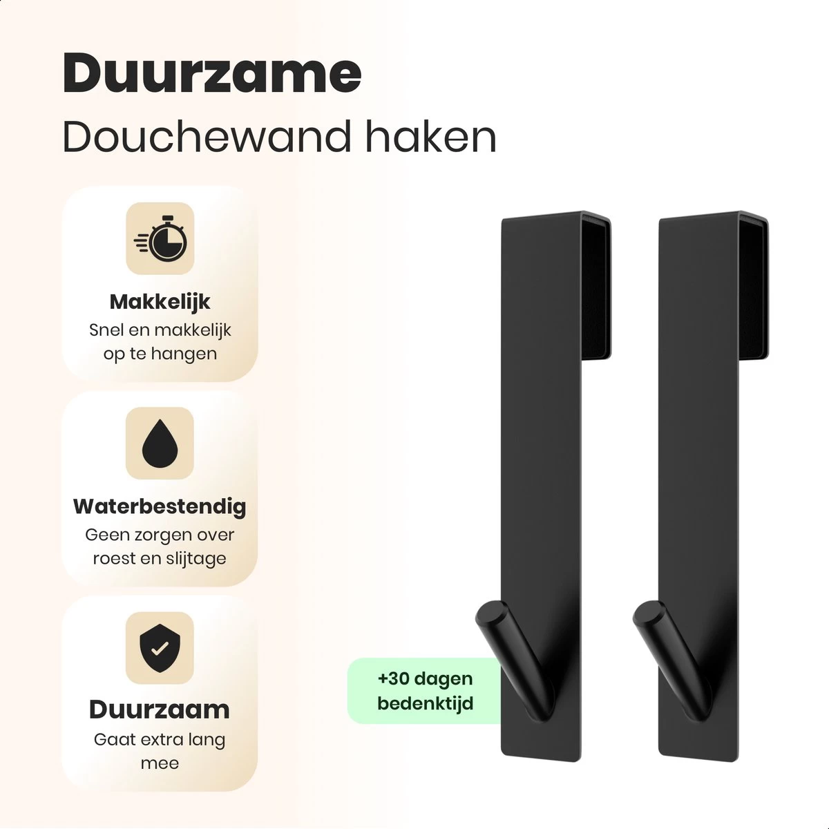 Onze haken zijn niet alleen functioneel, ze zijn ook stijlvol. Met een strak en modern design zullen deze haken de uitstraling van je douche- of badkamer versterken. Bovendien super snel en gemakkelijk te instaleren. Hang ze gewoon aan je douchewand of douchedeur en ze zijn klaar voor gebruik. Geen gereedschap of speciale vaardigheden nodig.