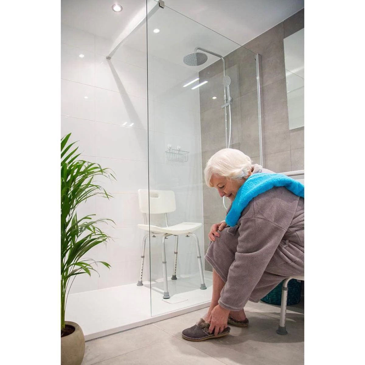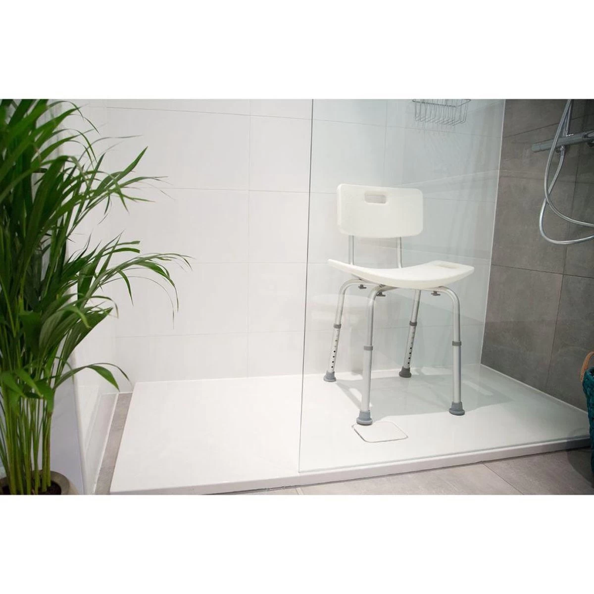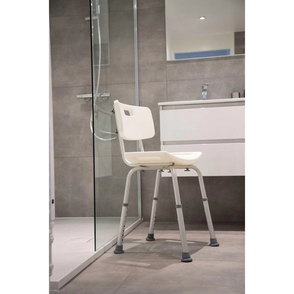 Kleur: wit Materiaal: aluminium en kunststof Afmetingen: 50,5 x 50 x (70,5-88) cm (B x D x H) Maximaal draagvermogen: 120 kg Verstelbare hoogte van 34,5 cm tot 52 cm Veilige en comfortabele badstoel met afneembare rugleuning Met anti-slip doppen onderaan de voeten Alle onderdelen zijn eenvoudig schoon te maken Geschikt voor elke douche en badkuip Eenvoudig te monteren