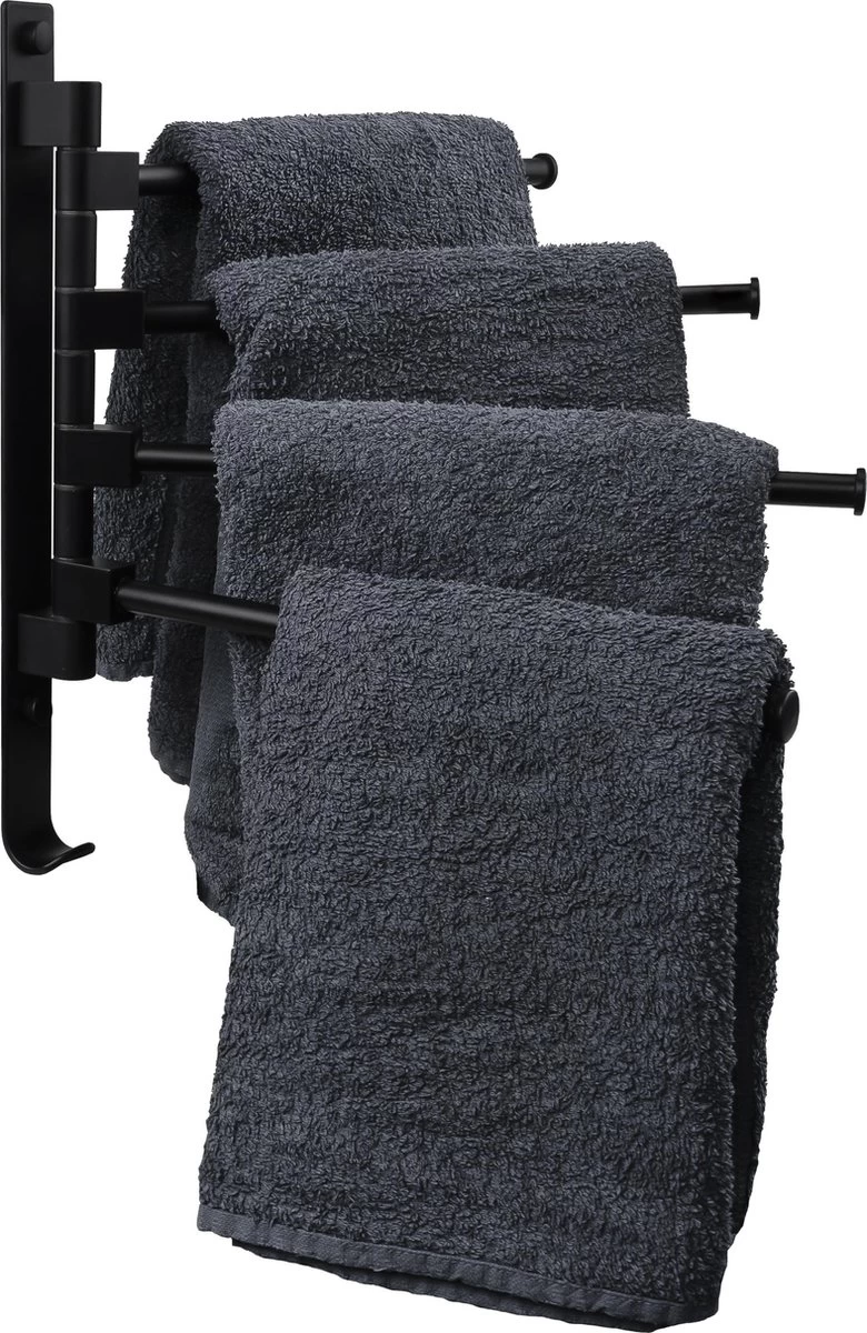 Dit rek heeft vier armen die om de as te bewegen zijn. Hierdoor kun je de armen als een waaier openen,waardoor iedere handdoek voldoende ruimte heeft. Ze hangen niet tegen elkaar aan en vallen daardoor mooi over hun eigen handdoekenarm heen. De beweegbaarheid van de armen is niet alleen functioneel,doordat het je de mogelijkheid geeft alle handdoeken op een plek te hangen,maar het staat ook nog eens chique,waardoor dit het perfecte product is om je badkamer dat luxe,strakke uiterlijk te geven.