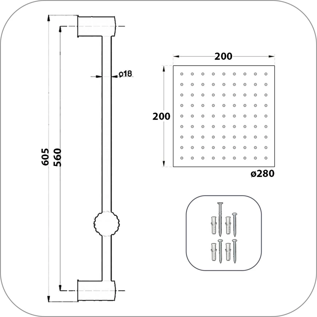 Douchekopmaat: Doorsnede 28 cm (L x B: 20 cm x 20 cm)