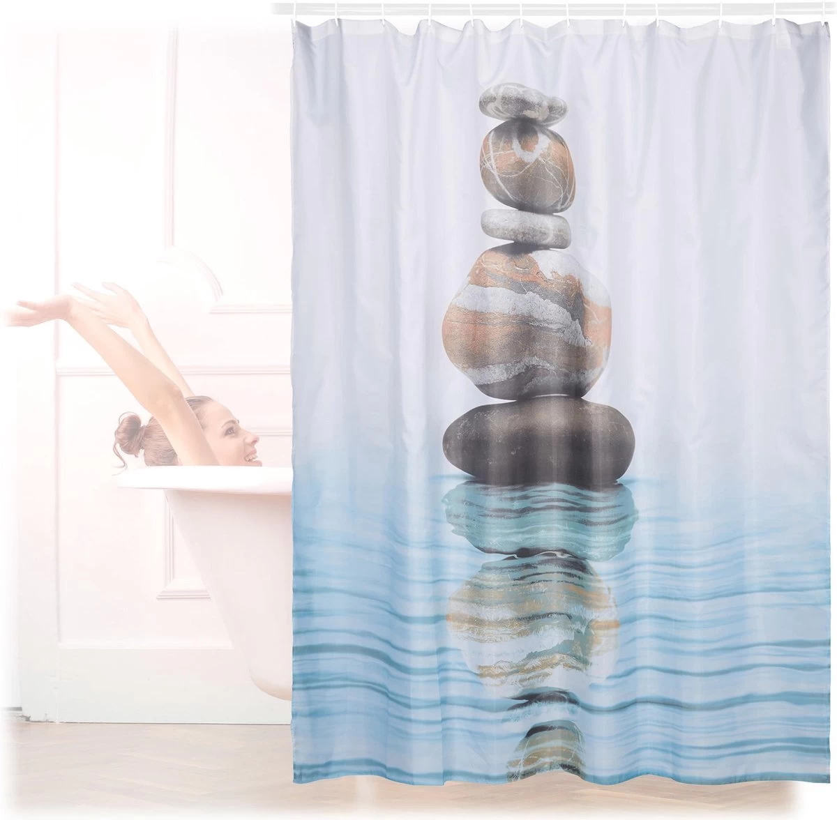 Het douchegordijn met wellness-fotoprint geeft de badkamer een Aziatische touch. De print laat een klein stapeltje stenen zien, welke lijken te zweven boven het wateroppervlak. Laat het ontspannende motief bij elke badkamerbezoek op je inwerken.