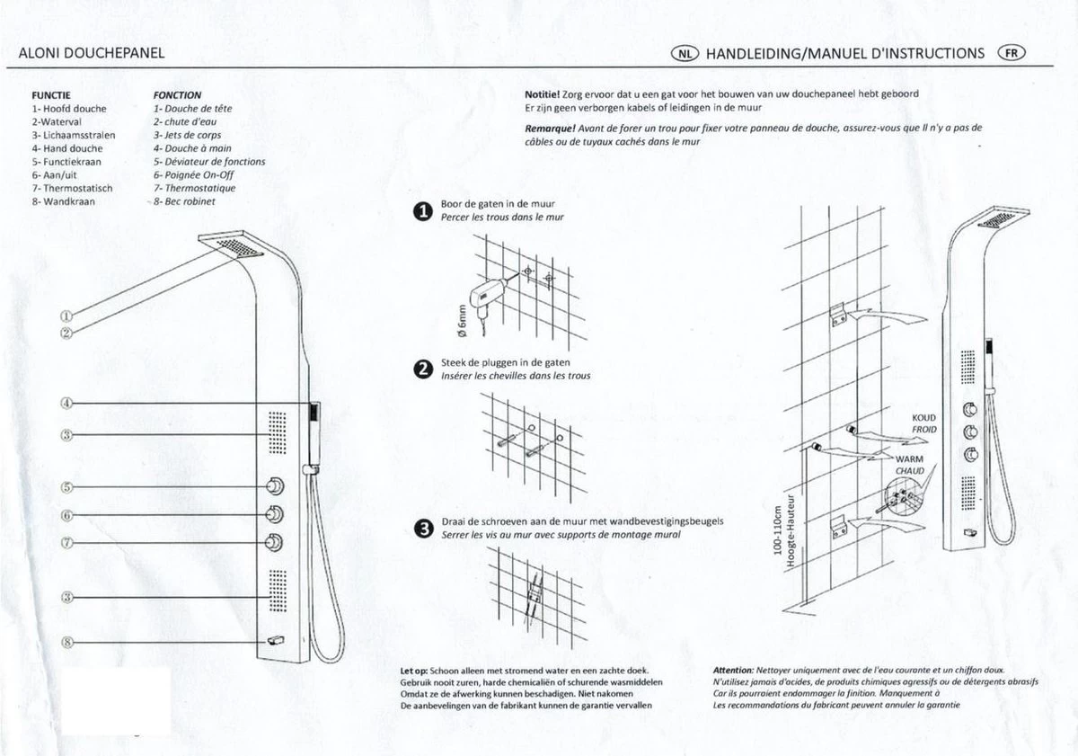 | Verpakkingsinhoud | 1. Douchepaneel 2. Messing verchroomde handdouche 3. Chroom doucheslang 4. Bevestigingsmaterialen |
