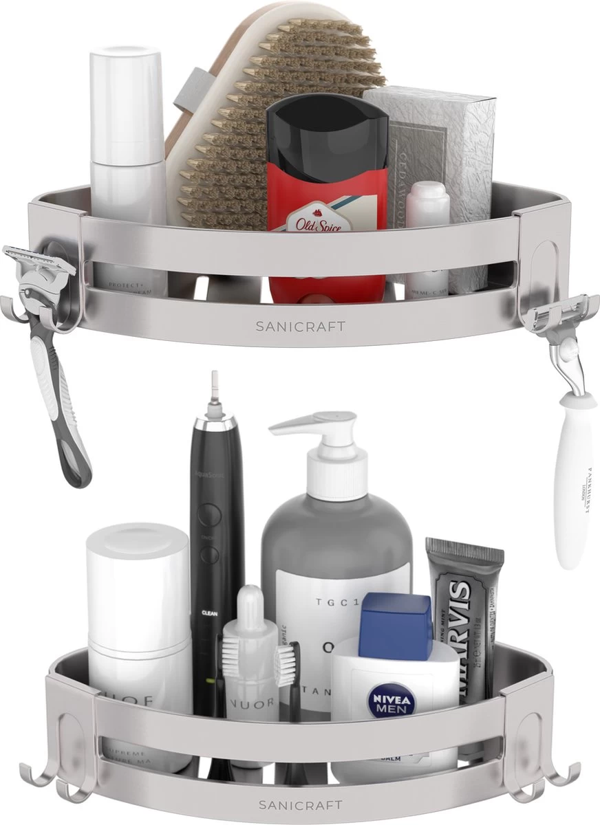 Het tweedelige doucherekje is groot genoeg voor alle douchespullen van jou en je partner, of zelfs het hele gezin. Dankzij de speciale haken zijn rondslingerende scheermesjes en sponzen voorgoed verleden tijd.