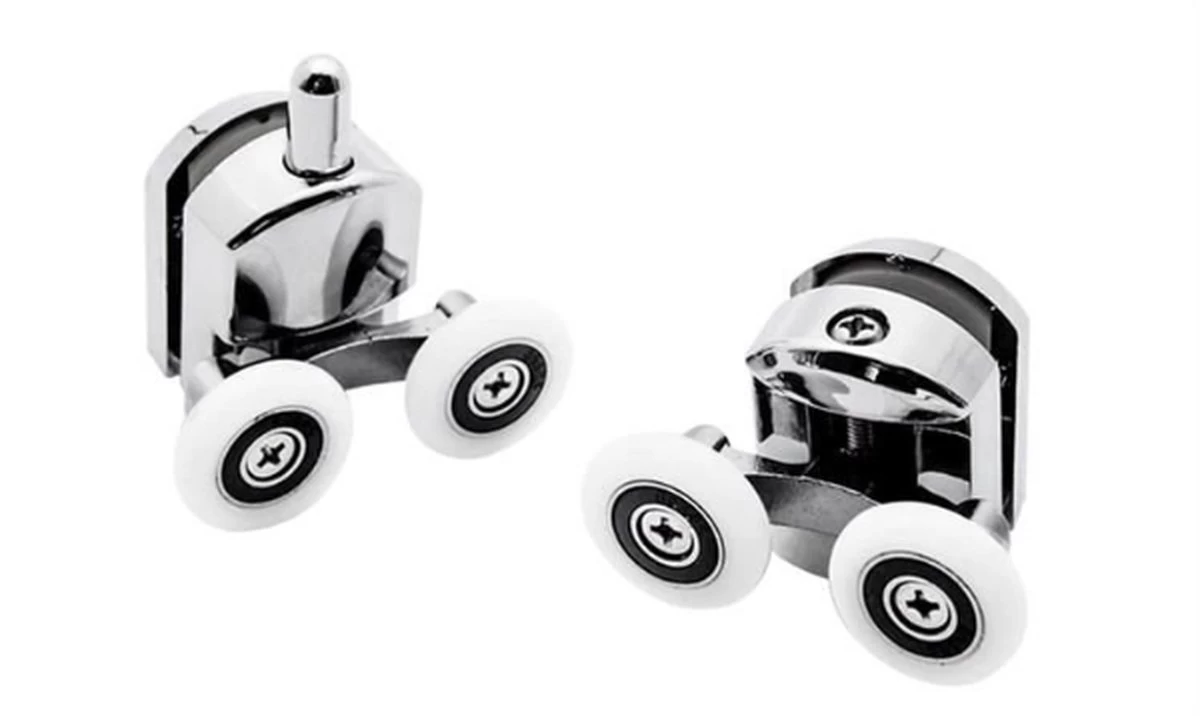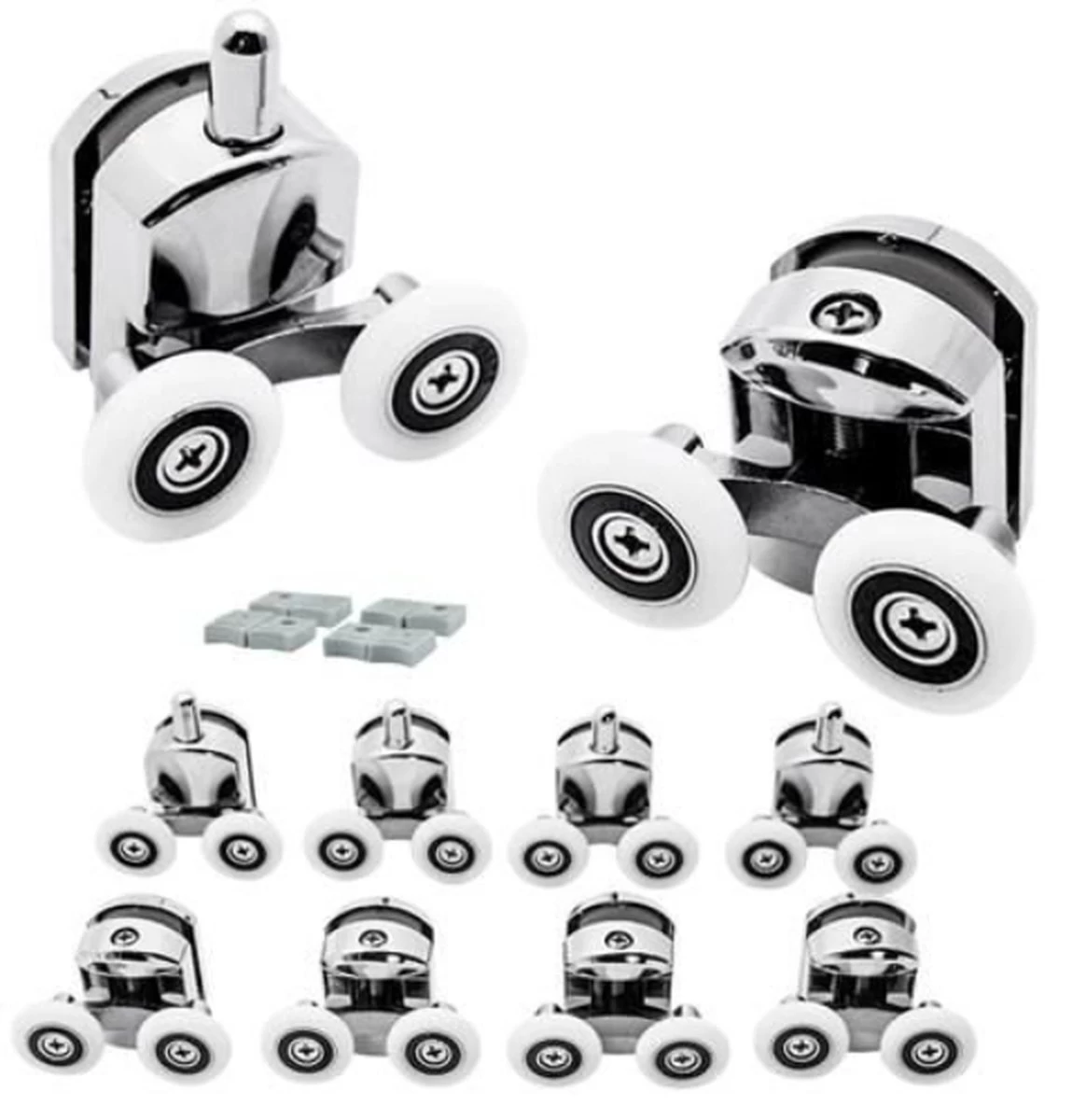 Set van 8 roestvrije verchroomde (4 onder, 4 boven) rollen voor douchedeuren. Past op de meeste soorten douchedeuren. Van roestvrij staal, bovendien verchroomd. De robuuste wielen zijn van slijtvaste kunststof.