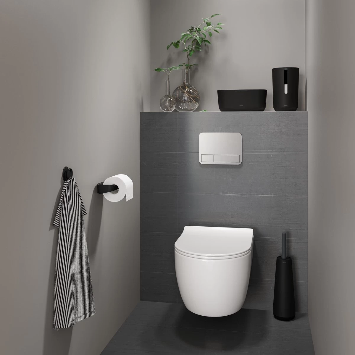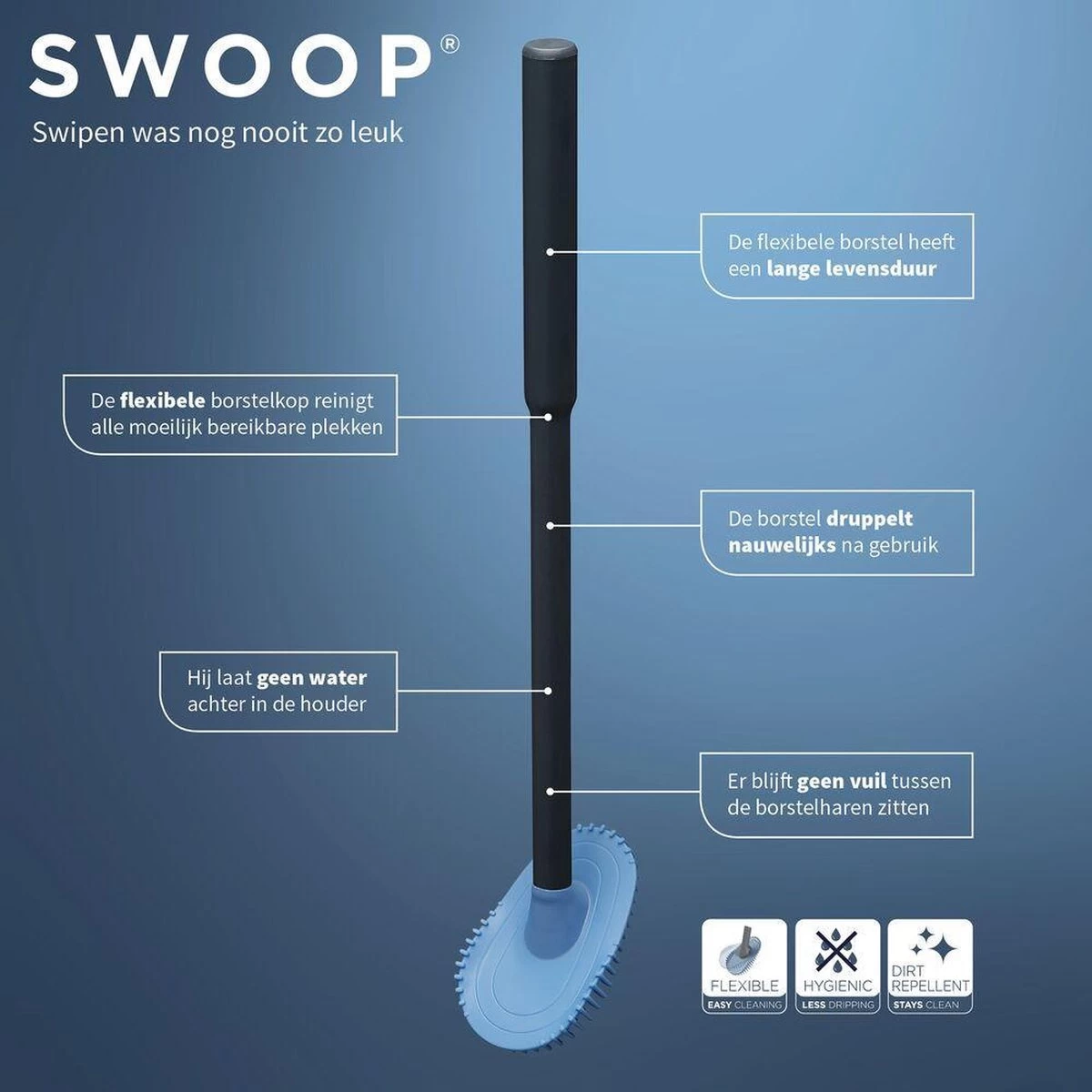 Een fris en modern gevoel in toilet of badkamer dankzij de zwarte wc-borstelhouder van Tiger Tess. Deze vrijstaande houder is voorzien van de nieuwe Swoop® flexibele toiletborstel. Met deze innovatieve borstelkop reinig je met gemak moeilijk bereikbare plekken. Dankzij de vorm en het speciale materiaal met siliconen eigenschappen, blijft er geen viezigheid achter en druppelt hij nauwelijks na als je hem terug in de houder plaatst. Draai de houder om en de borstel is niet langer meer in het zicht.