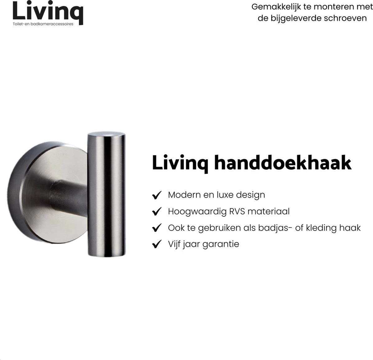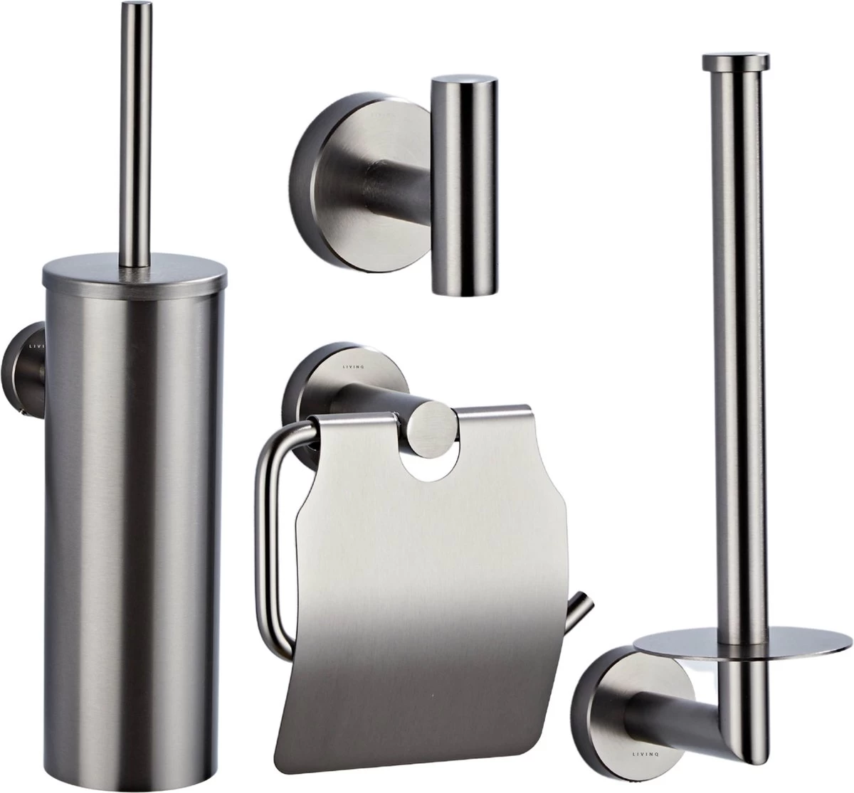 Het toiletaccessoireset van LIVINQ bestaat uit een toiletborstelhouder, een toiletrolhouder met klep, een reserverolhouder en een handdoekhaak. (bijvoorbeeld voor het ophangen van een handdoek of badjas).