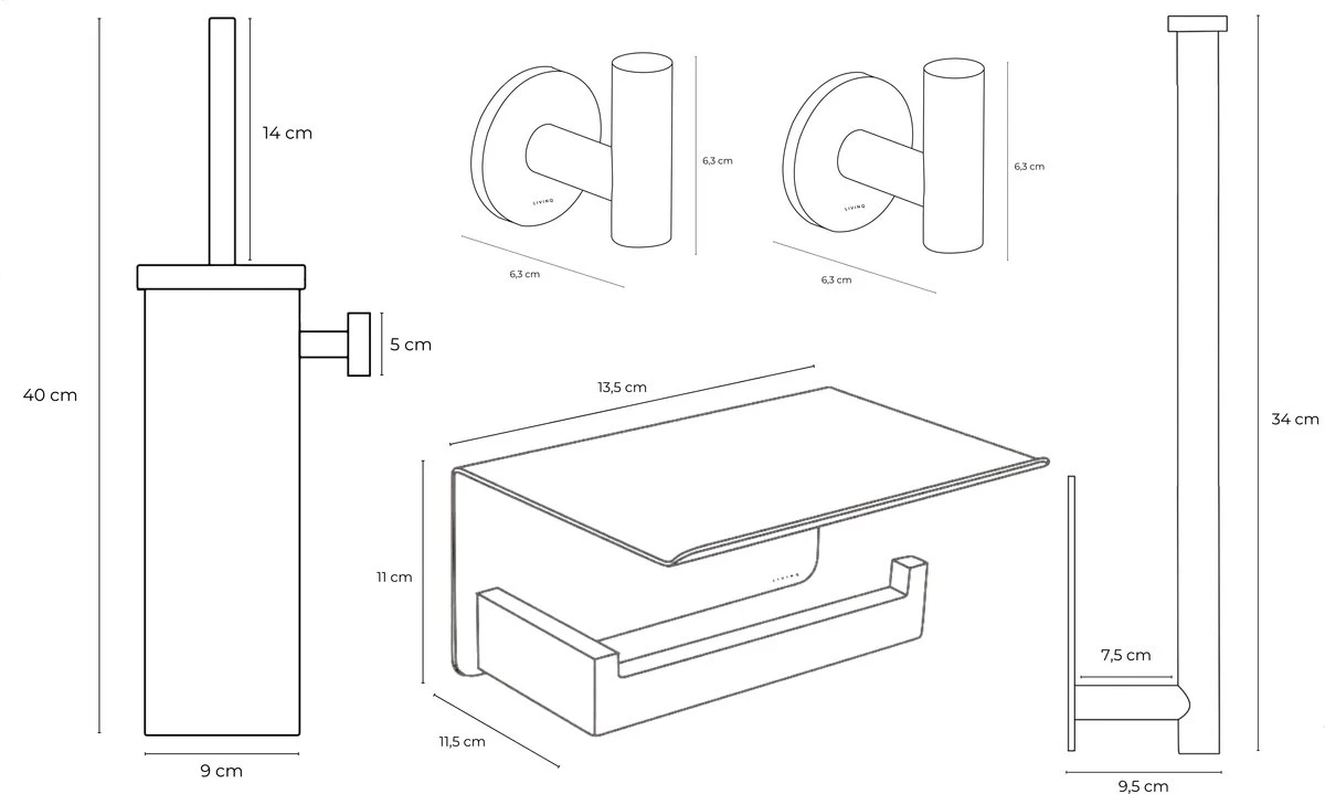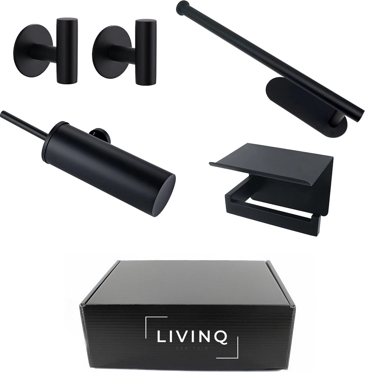 Het toiletset van LIVINQ bestaat uit een toiletborstel inclusief houder, een toiletrolhouder, twee handdoekhaakjes, en een reserverolhouder voor 3 rollen. De elementen uit deze set zijn allemaal gemaakt van RVS en hebben een afwerking in een fraaie, mat zwarte kleur. De toiletborstel heeft een bevestigingsplaatje die u vast kunt schroeven aan de muur. De toiletrolhouder, handdoekhaakjes en de reserverolhouder kunt u gemakkelijk bevestigen doormiddel van de krachtige plakstrip.