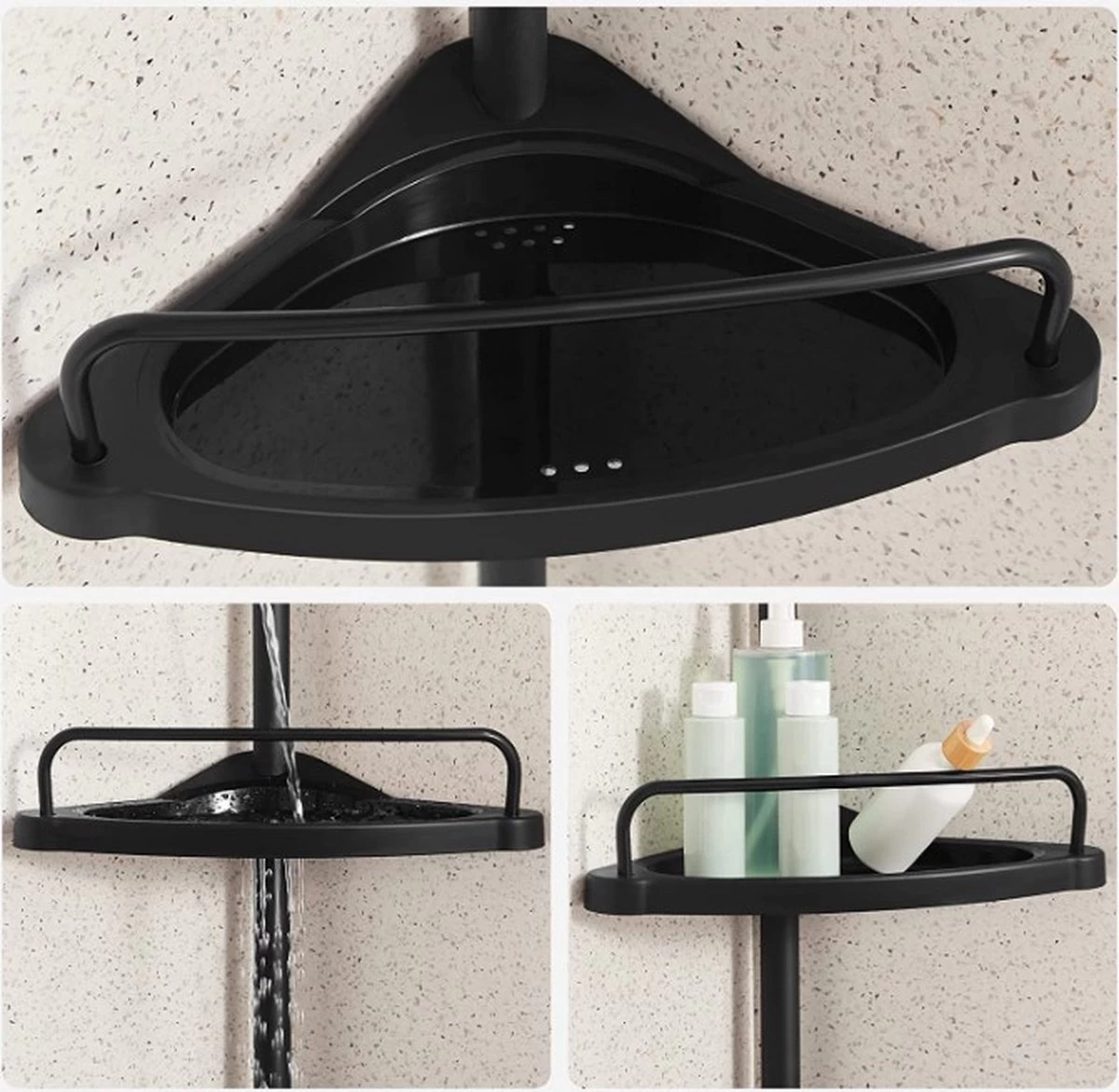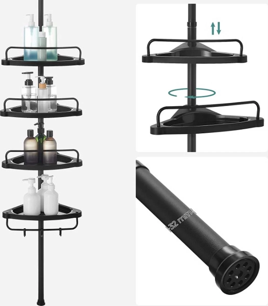 Niets zo onhandig als steeds te moeten bukken om de douchegel te grijpen, toch? Kies voor dit 4-delig schap en vermijd dergelijk ongemak! Het eerste grote voordeel van dit doucherekje schuilt in zijn vele niveaus. Een groot gezin, waar meerdere personen dezelfde douche gebruiken komt vaak niet toe met één schap. Hetzelfde geldt voor iemand met een iets grotere verzameling aan producten. Voortaan hoeft dat ook geen zorg meer te zijn. Speel met de lengte, plaats de waterdoorlatende plankjes waar je maar wilt en creëer een geheel dat comfortabel is voor jou. De telescopische buis wordt op zowel vloerhoogte als plafondhoogte vastgemaakt.