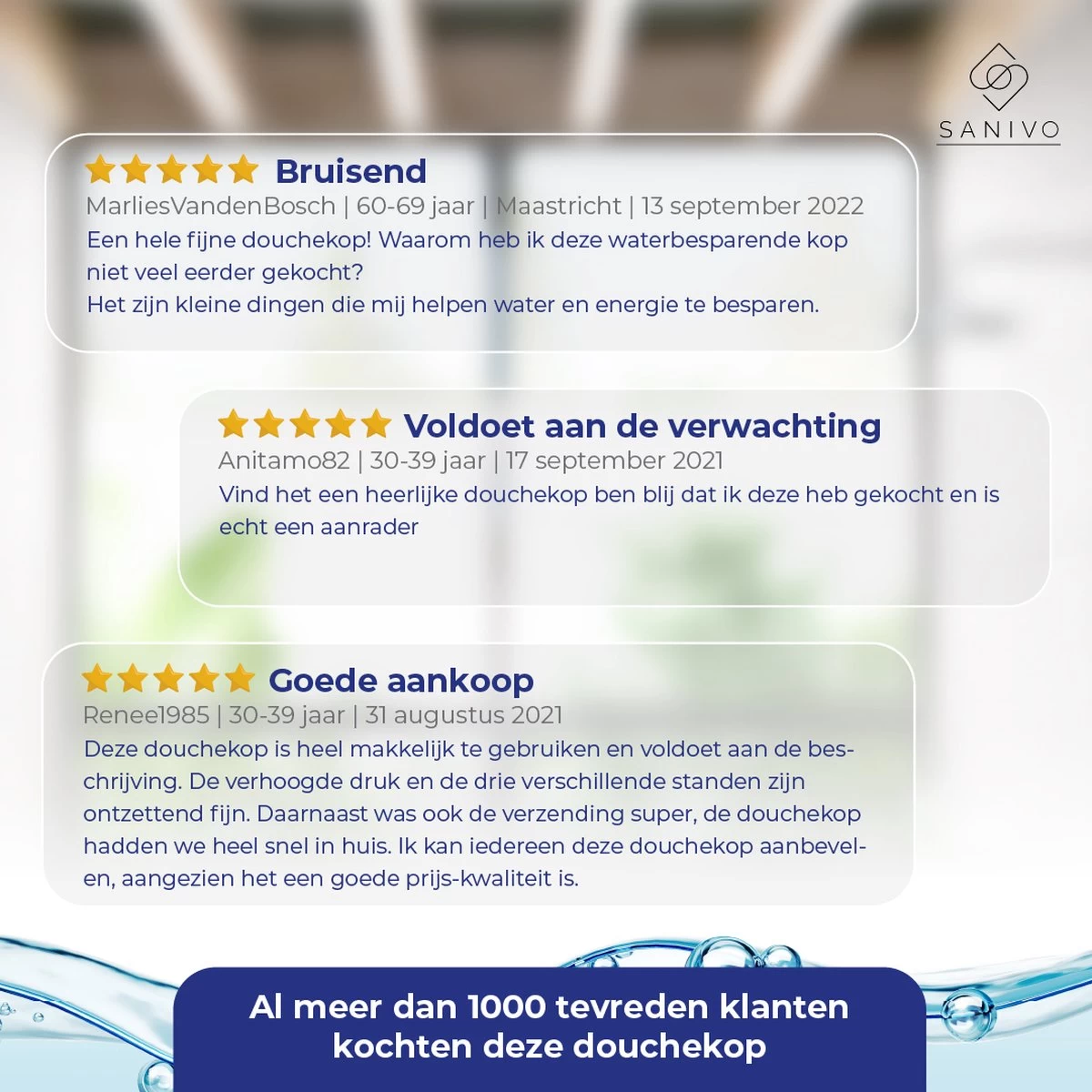 Heb jij last van een lage waterdruk in jouw douche? Of voelt het water hard aan door te veel kalk? Dan is de SANIVO Ionische Douchekop de beste keuze! De SANIVO ionische douchekop staat bekend om de drie aanpasbare standen (regen, massage en combinatie) en de mineraalstenen die jouw douchewater extra zuiveren. De ionische douchekop levert een hogere waterdruk dan een reguliere douchekop én werkt waterbesparend. Hierdoor douche je fijner, en bespaar je zowel op je portemonnee als op het milieu.