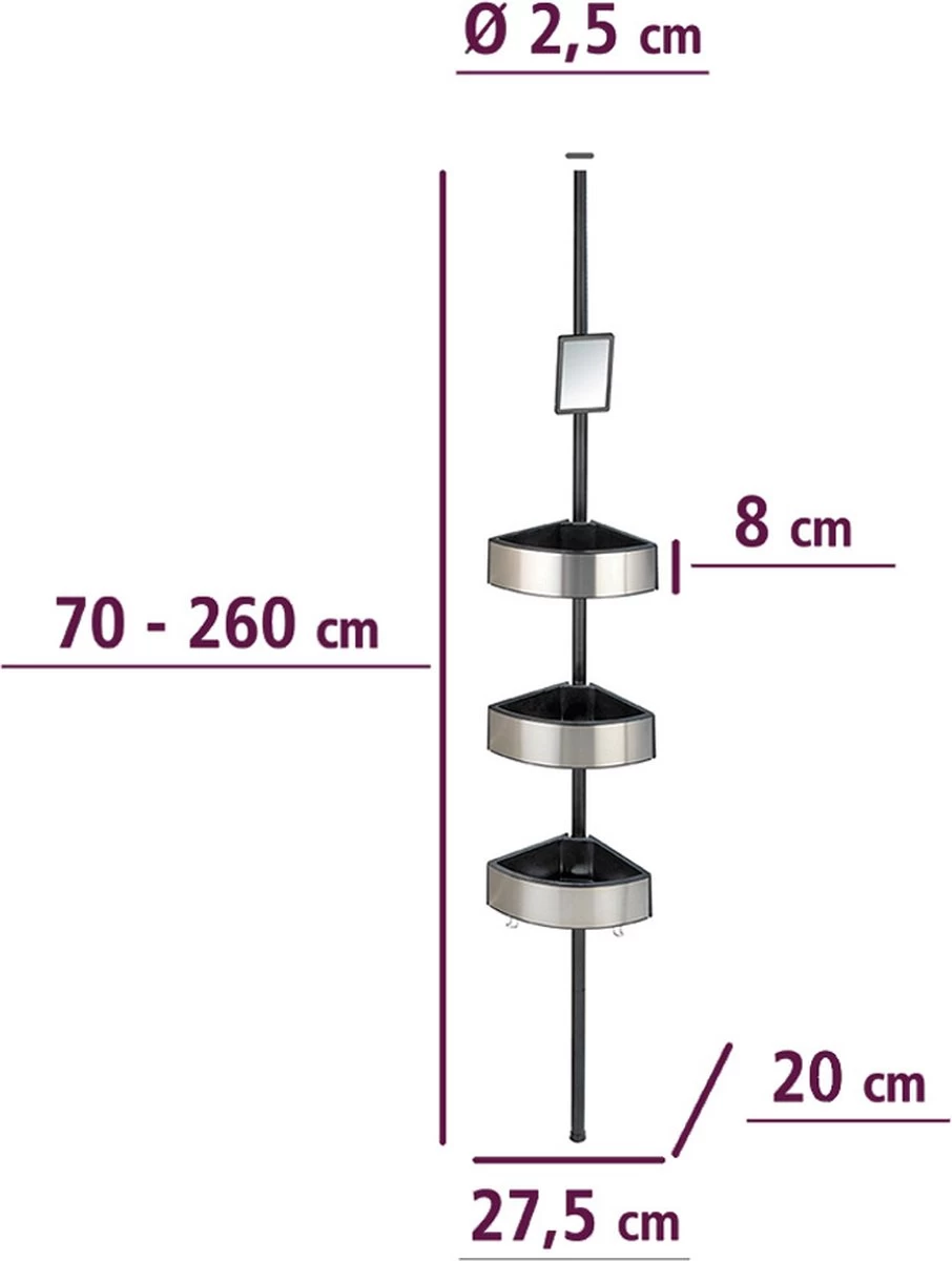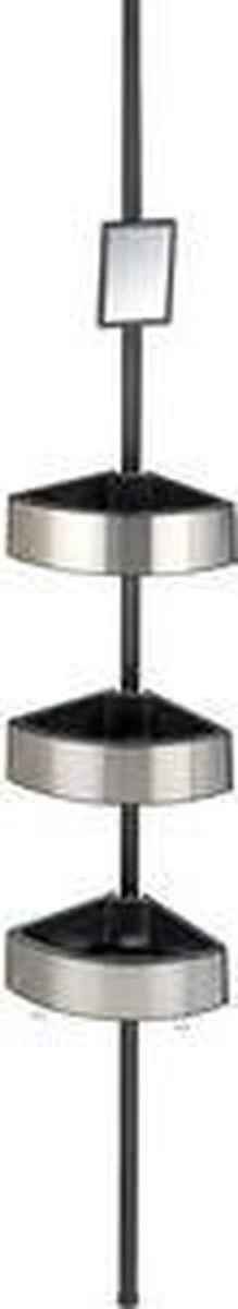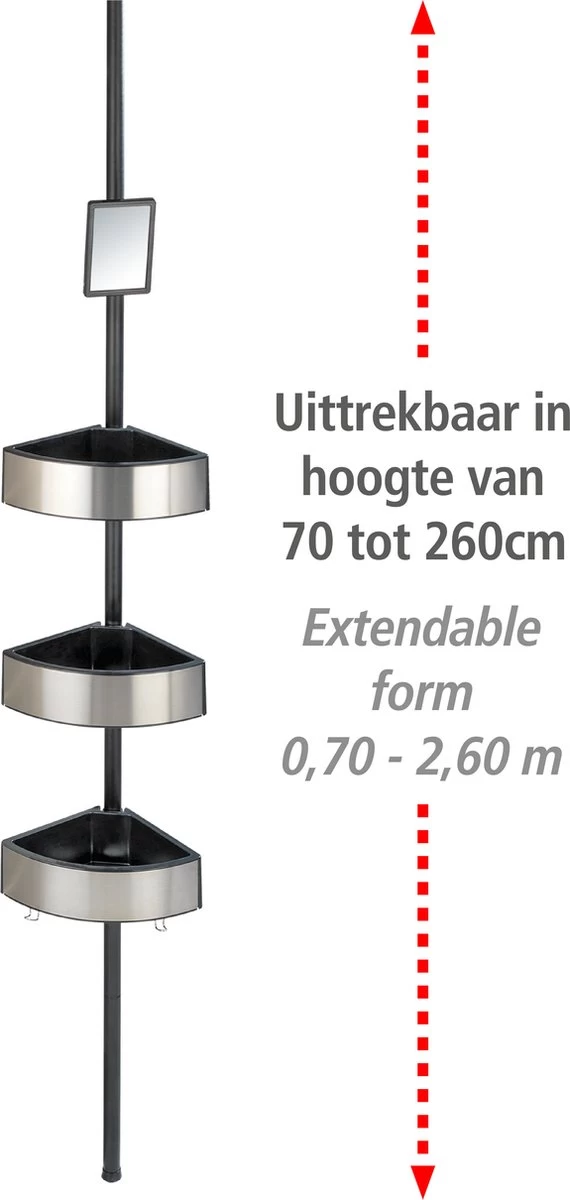 Het handige telescopische doucherek Big Black heeft 3 grote korven en een spiegel en kan geplaatste worden in de douche, de hoek bij badkuip of in een hoek van de badkamer.