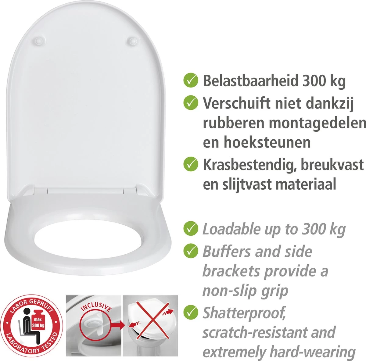 De toiletbril weegt 3,1 Kg en is gemaakt van Duroplast, dat gemakkelijk te reinigen is en bestand is tegen een belasting tot 300 kg.